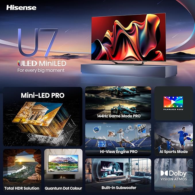 – Hisense U7N สมาร์ททีวีที่ประสิทธิภาพภาพและเสียงที่ได้รับการอัพเกรดเพื่อความบันเทิงที่เหนือชั้นเปลี่ยนเกมและความบันเทิงให้เหนือชั้นกว่าที่เคยสัมผัสด้วย Hisense U7N สมาร์ททีวีจอแสดงผลอัจฉริยะ อัดแน่นไปด้วยคุณสมบัติที่น่าตื่นเต้นมากมายที่ช่วยปรับปรุงประสบการณ์การรับชมและการเล่นของคุณอย่างมาก ด้วย Mini-LED Pro ทำให้มั่นใจได้ถึงระดับความสว่างและการสร้างสีในระดับใหม่ โซลูชัน HDR ซึ่งได้รับการปรับปรุงประสิทธิภาพ โดยมอบรายละเอียดมากขึ้นในฉากที่ท้าทาย พร้อมมอบพลังการประมวลผลที่มากขึ้น รวมถึง Dolby Vision สามารถให้รายละเอียดที่น่าทึ่ง ภาพที่มีชีวิตชีวาและสดใส