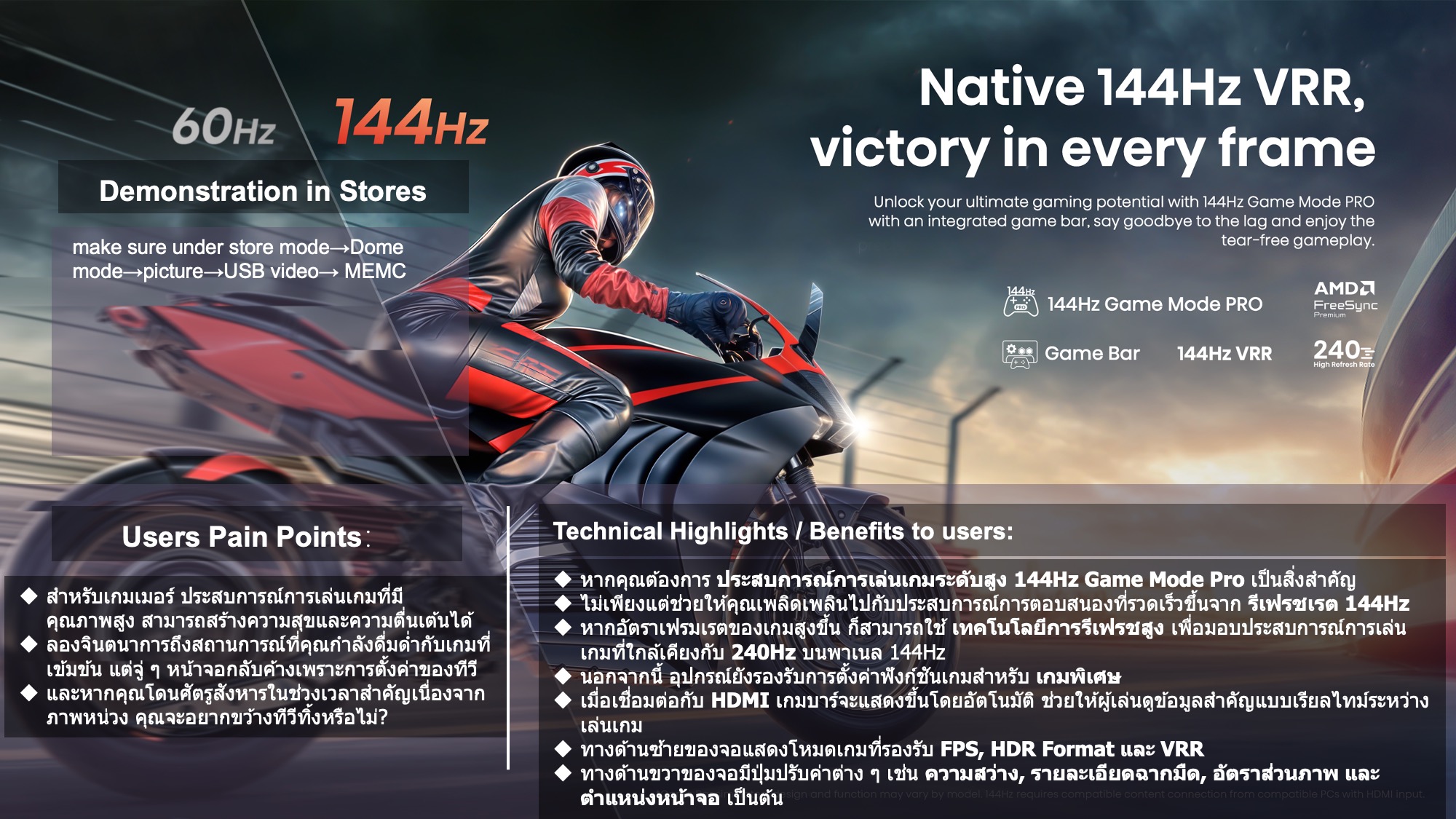 – 144Hz + MEMC : ภาพลื่นไหล ไม่เบอล เหมาะกับเกมและกีฬา