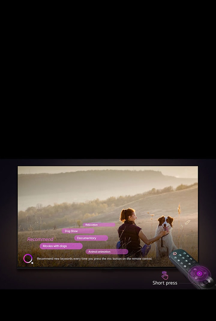 LG Magic Remote ที่มีปุ่มวงกลมตรงกลาง โดยมีแสงสีม่วงนีออนเล็ดลอดออกมารอบๆ ปุ่มเพื่อไฮไลต์ แสงสีม่วงอ่อนๆ ล้อมรอบรีโมทบนพื้นหลังสีดำ Magic Remote ความมหัศจรรย์ อยู่ในมือคุณแล้ว ปลดปล่อยตัวเองจากข้อจำกัดของปุ่มแบบเดิมๆ LG Magic Remote ปลดล็อคฟังก์ชันอัจฉริยะทั้งหมดของ LG TV ของคุณด้วยการคลิก เลื่อน หรือใช้เสียงของคุณ