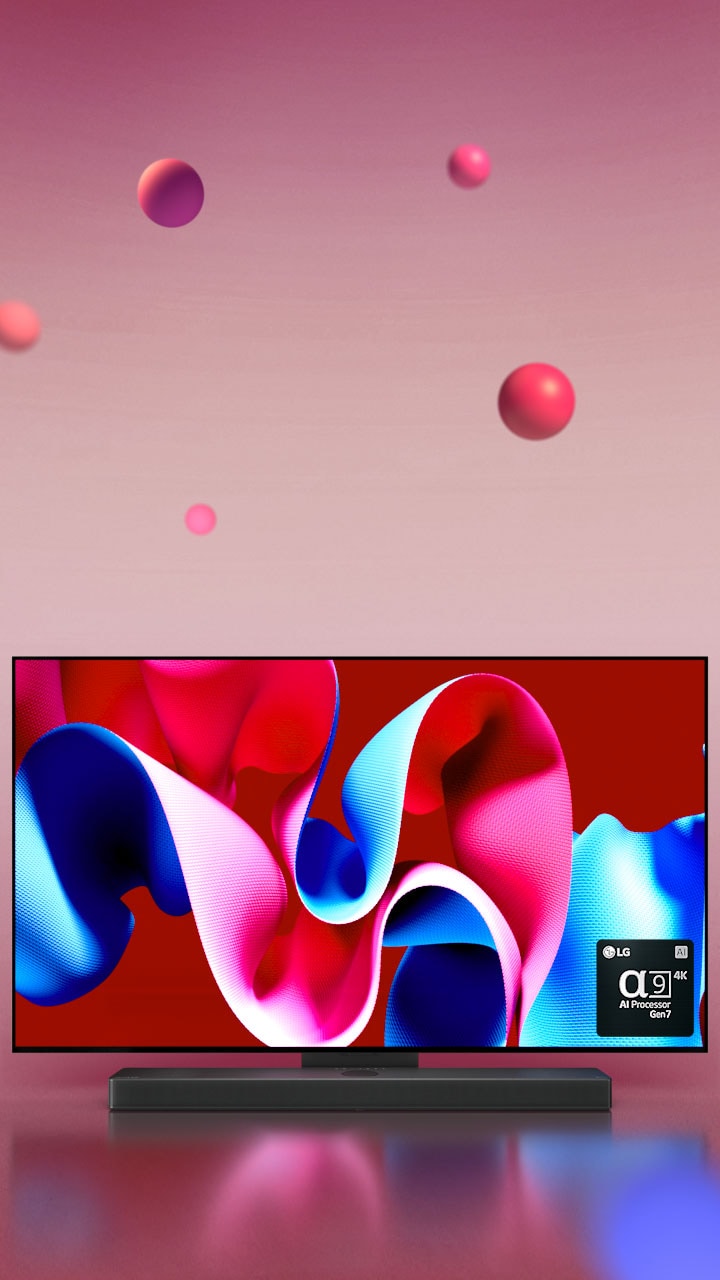 ในขณะที่ส่วนที่เหลือของภาพดูหมองคล้ำ LG OLED TV เป็นฟองเสียงและคลื่นที่เปล่งออกมาจากหน้าจอและเติมเต็มพื้นที่ การปรับแต่งเอไอ ซิงค์กับวิธีการรับชมของคุณ
