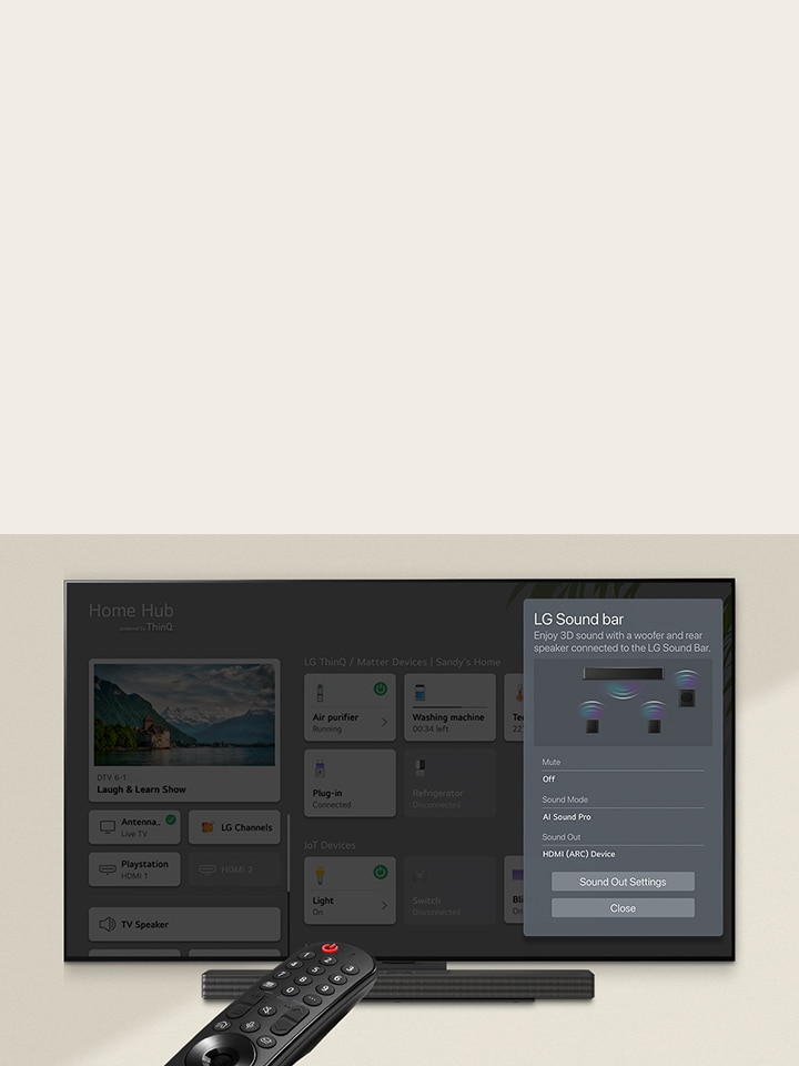 ความเรียบง่ายเพียงปลายนิ้วสัมผัส เข้าถึงอินเทอร์เฟซ WOW บน LG TV เพื่อการควบคุมซาวด์บาร์ที่เรียบง่าย เช่น โหมด โปรไฟล์ และคุณสมบัติที่มีประโยชน์