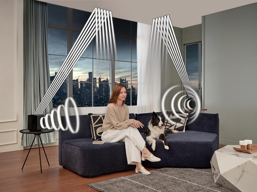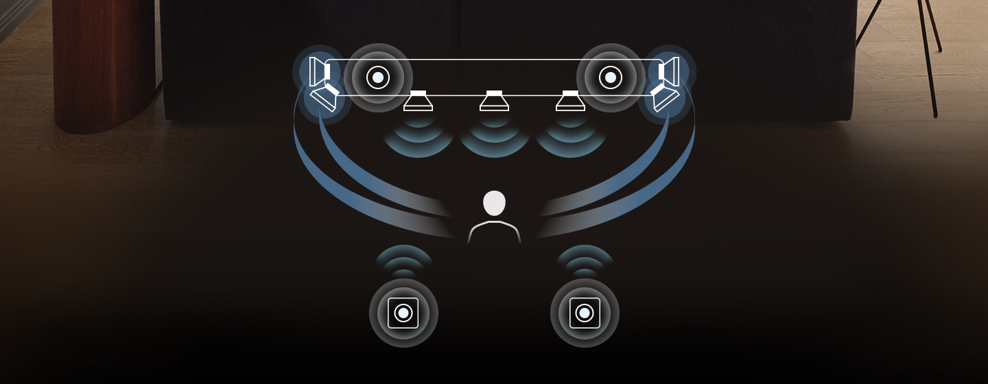 ด้วยลำโพงหลังระบบยิงเสียงขึ้นด้านบนแบบไร้สายของเรา เสียงจะฉายขึ้นและกระจายล้อมรอบทั่วทุกที่ในห้องเพื่อให้ได้เสียงที่มีคุณภาพระดับโรงภาพยนตร์ได้ในที่บ้าน