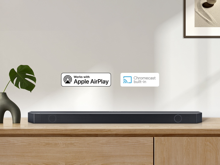 * Apple, AirPlay, iPhone, iPad และ Mac เป็นเครื่องหมายการค้าของ Apple Inc. ที่จดทะเบียนในสหรัฐฯ และประเทศอื่น ๆ * ซาวด์บาร์ Samsung รุ่นนี้รองรับ AirPlay 2 และจำเป็นต้องใช้งานกับระบบปฏิบัติการ iOS 11.4 ขึ้นไป * ความพร้อมใช้งานของบริการนี้อาจแตกต่างกันไปตามภูมิภาค/ผู้ให้บริการ/ภาษา * ในการเชื่อมต่อซาวด์บาร์กับอุปกรณ์โทรศัพท์มือถือผ่านเครือข่ายไร้สาย (Wi-Fi) จำเป็นต้องใช้แอป SmartThings