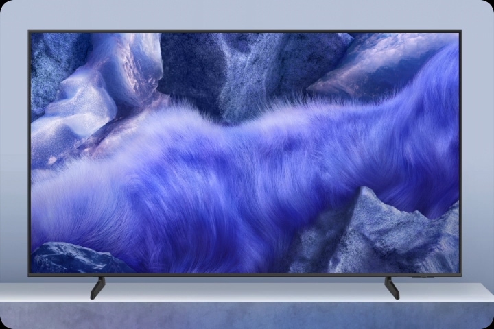 ทีวีมีภาพทิวทัศน์แฟนตาซีของหญ้าสีฟ้าสดใสปรากฏบนหน้าจอ โลโก้ Samsung Vision AI