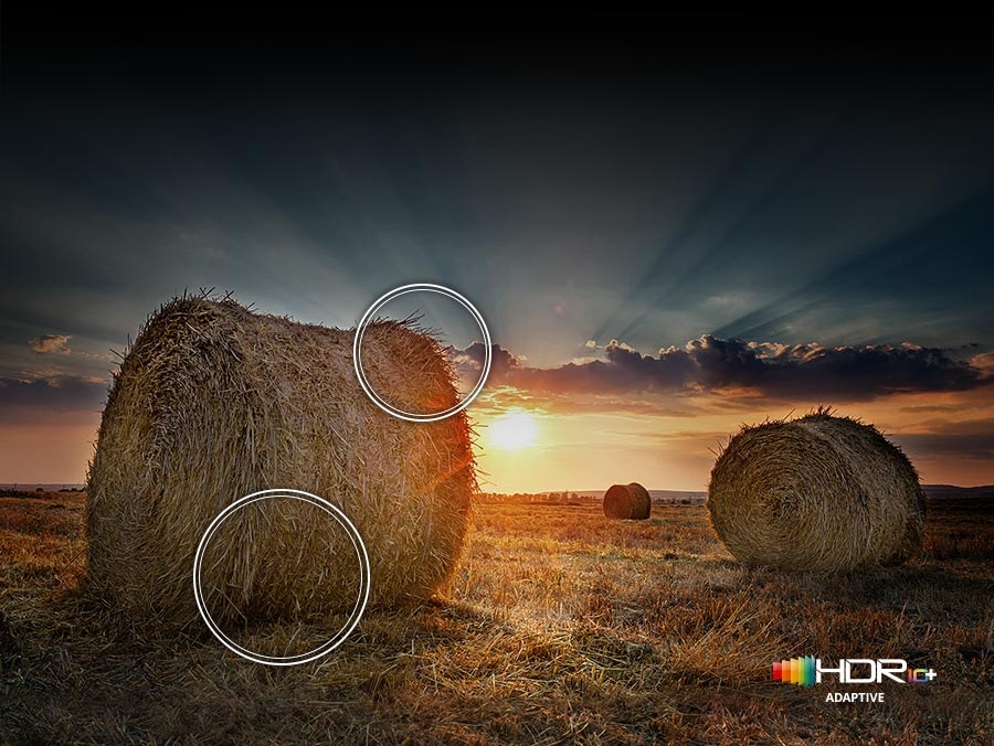 พระอาทิตย์กำลังลับขอบทุ่งกว้างโดยเน้นกองหญ้าแห้งขนาดใหญ่ ฉากหลังจากใช้เทคโนโลยี HDR 10+ ADAPTIVE จะสว่างและคมชัดกว่าเวอร์ชัน SDR มาก