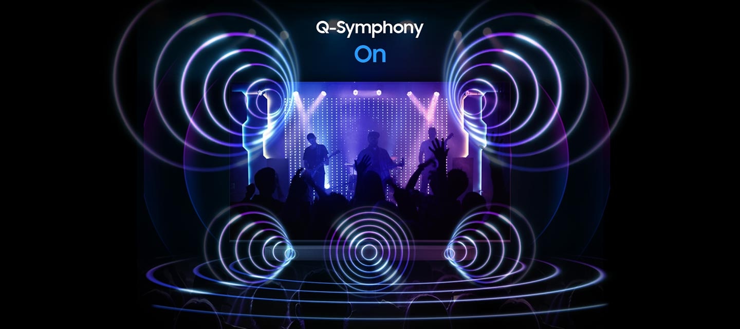 หน้าจอทีวีแสดงภาพคอนเสิร์ตที่มีชีวิตชีวา ตรงด้านล่างเป็น Soundbar เมื่อ Q-Symphony ปิดอยู่ ซาวด์บาร์จะเล่นเสียงด้วยตัวเอง โดยปล่อยคลื่นเสียงขนาดเล็กออกมา เมื่อ Q-Symphony เปิดอยู่ ทีวีและซาวด์บาร์จะเล่นเสียงพร้อมกันพร้อมๆ กัน โดยทั้งคู่จะส่งคลื่นเสียงขนาดใหญ่ซิงค์กัน