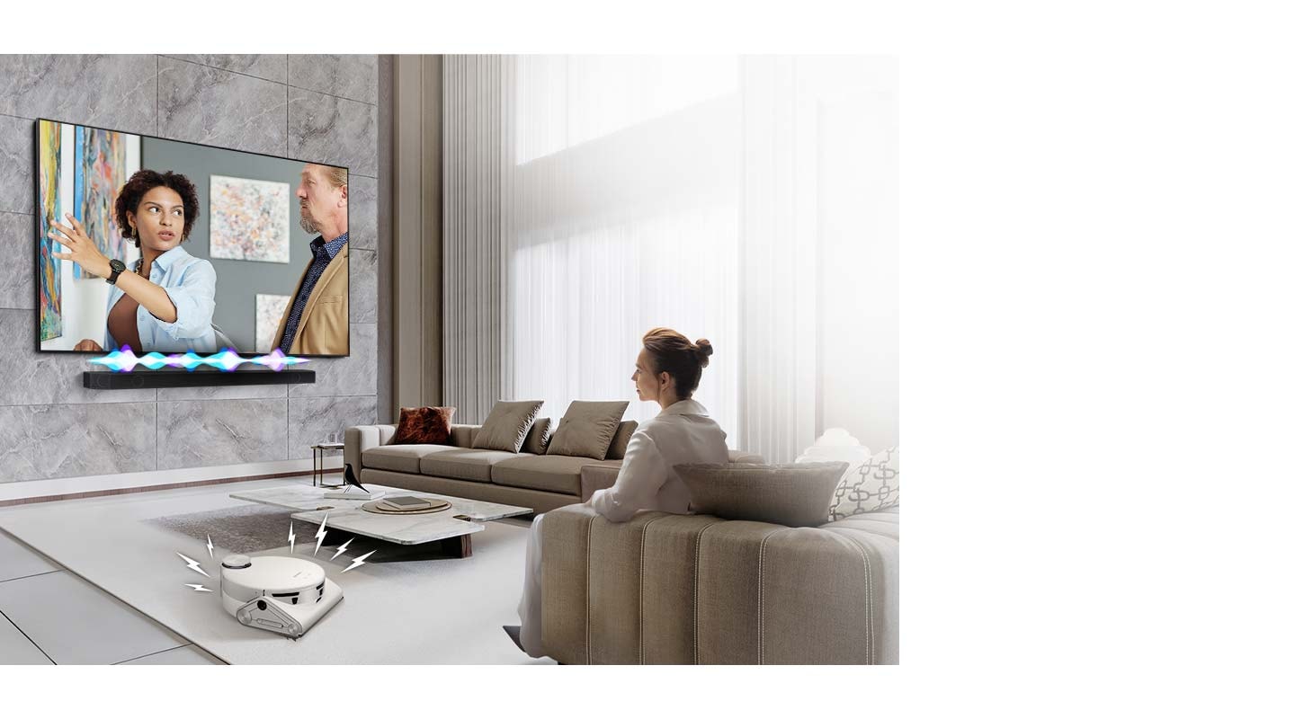 ผู้หญิงคนหนึ่งกำลังดูทีวีซึ่งมี Soundbar ติดตั้งอยู่ด้านล่างโดยตรง ซาวด์บาร์มีแถบเสียงแสดงระดับเสียง หุ่นยนต์ดูดฝุ่นม้วนตัวเข้ามาในห้อง โดยส่งเสียงรบกวนจากสลักเกลียวไฟ ในการตอบสนอง Soundbar จะเล่นด้วยระดับเสียงที่ดังขึ้น โดยแถบเสียงจะให้กิจกรรมที่มากขึ้น Samsung Audio Lab สร้างขึ้นมาโดยเหล่าผู้เชี่ยวชาญด้านนวัตกรรมเสียง