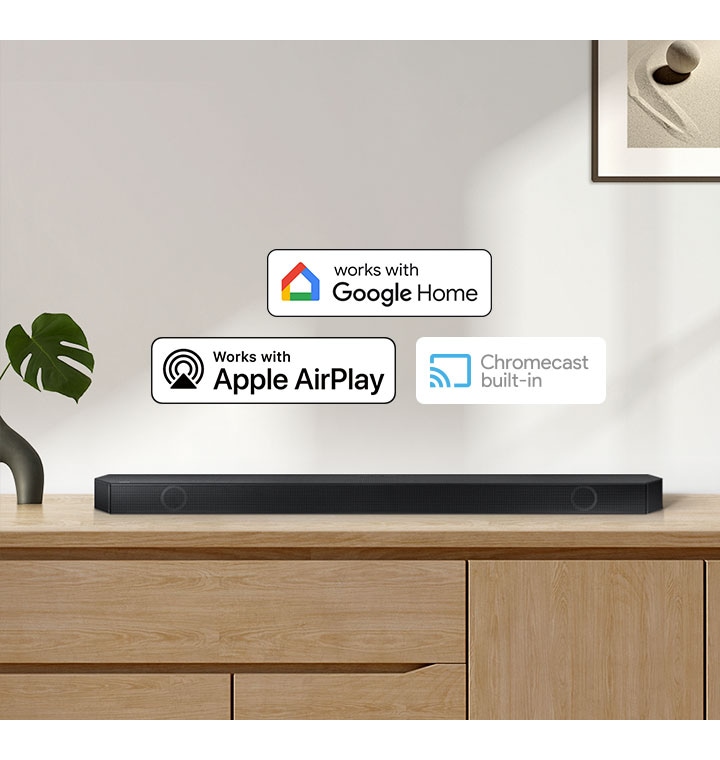ผู้ช่วยคำสั่งเสียงและสตรีมมิ่ง สตรีมเพลงโปรดของคุณและควบคุมด้วยเสียงของคุณ ควบคุมซาวด์บาร์ด้วยเสียงของคุณโดยใช้อุปกรณ์ที่รองรับ Google Assistant และมี Chromecast ในตัว คุณยังสามารถใช้ Chromecast ในตัวเพื่อสตรีมเนื้อหาเสียง รวมถึงเพลงที่คุณชื่นชอบ หรือคุณสามารถเชื่อมต่อกับ AirPlay เพื่อสตรีมเสียงได้ เพียงแตะไอคอน AirPlay บนอุปกรณ์ Apple ของคุณ ด้วย Apple AirPlay คุณสามารถเพลิดเพลินกับเพลงหรือพ็อดแคสต์ที่คุณชื่นชอบจาก iPhone หรือ iPad ของคุณ