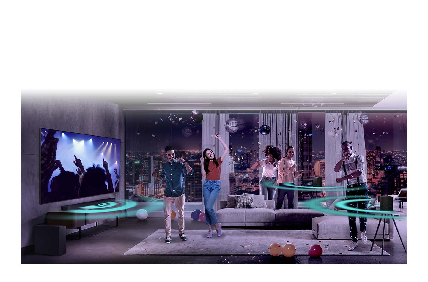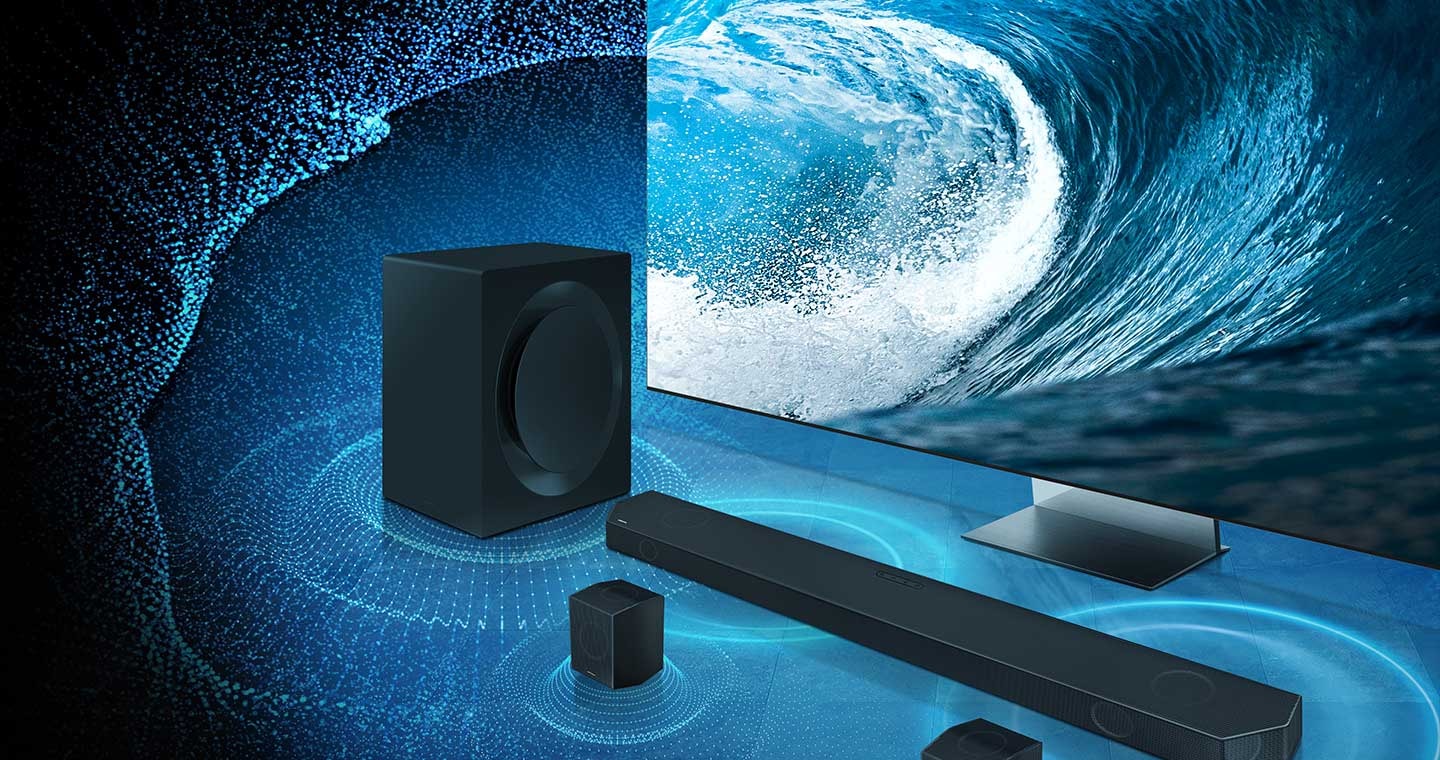 ซาวด์บาร์ที่วางอยู่ใต้ทีวี พร้อมด้วยโลโก้ของ Dolby Atmos และ DTS:X ไอคอนสัญญาณ Wi-Fi ปรากฏขึ้นใกล้กับ Soundbar ฉากนี้ซูมออกเพื่อเผยให้เห็นห้องนั่งเล่นทั้งหมด โดยมีลำโพงด้านหลังติดตั้งอยู่ด้านหลัง คลื่นเสียงเล็ดลอดออกมาจากซาวด์บาร์และลำโพงด้านหลัง สะท้อนจากเพดานและเคลื่อนที่ไปรอบๆ ห้อง