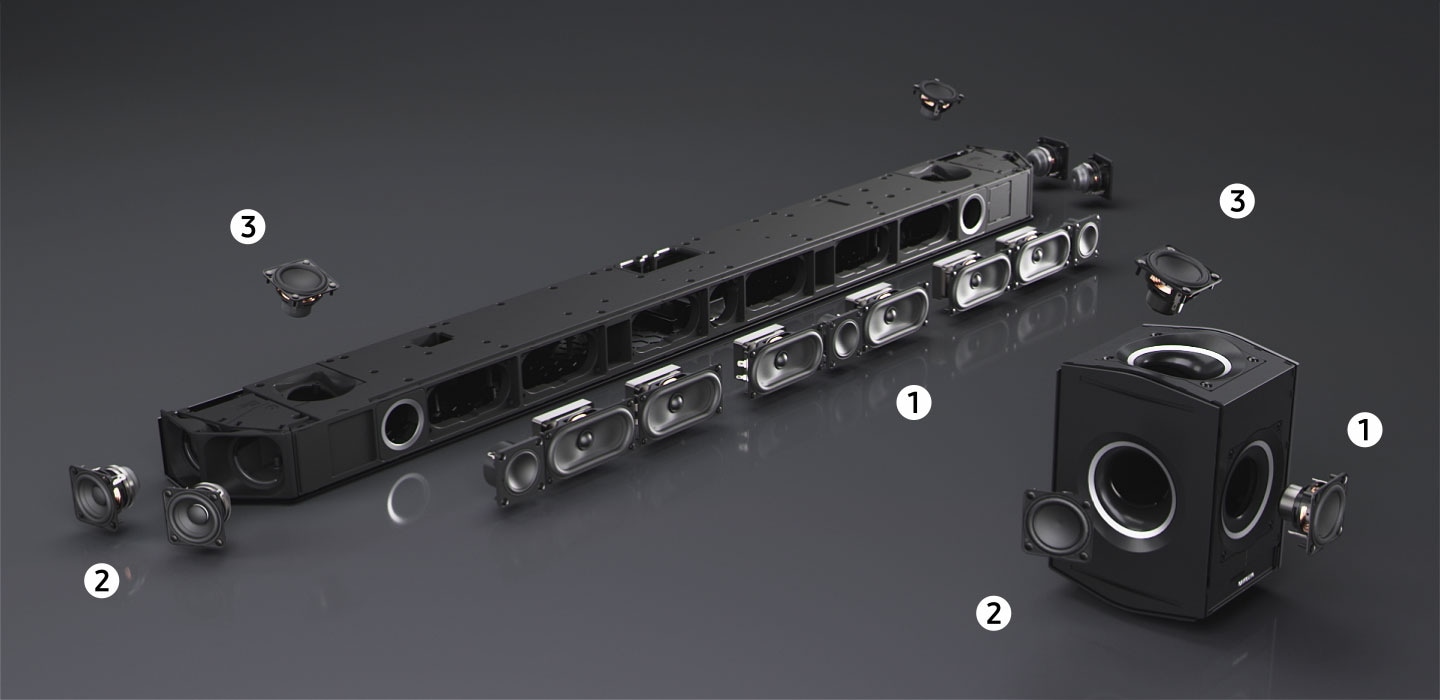 ซาวด์บาร์ปล่อยชีพจรเพียงจังหวะเดียวที่เคลื่อนที่ไปทั่วทั้งห้องและวิเคราะห์พื้นที่ จากนั้น Soundbar และซับวูฟเฟอร์จะปล่อยคลื่นเสียงออกมา เพื่อระบุว่ากำลังเล่นเสียง ไปดูกันว่าอะไรที่ทำให้ซาวด์บาร์นี้ให้เสียงที่สมจริงสุด ๆ ได้ ซาวด์บาร์นี้ที่ออกแบบมาเพื่อเสียงที่สมจริงสุด ๆ นั้นมีลำโพงสามแบบ ได้แก่ ลำโพงหน้า ①, ลำโพงข้าง ② และลำโพงยิงเสียงขึ้นด้านบน ③ ซึ่งได้รับการวางตำแหน่งไว้อย่างเหมาะสมบนเฟรมของซาวด์บาร์