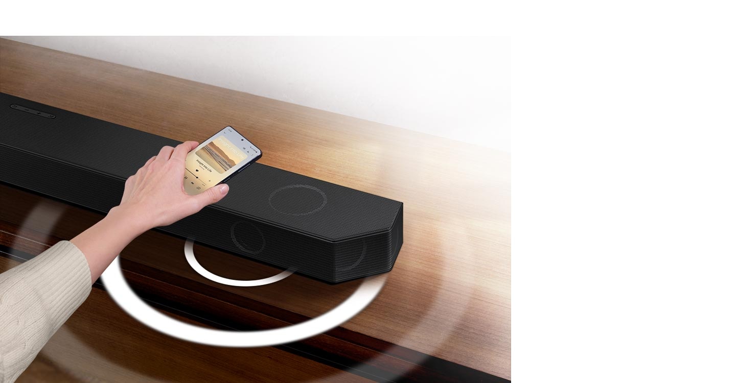 มือหนึ่งถือโทรศัพท์ที่กำลังเล่นเพลงและแตะเบาๆ กับซาวด์บาร์ ซาวด์บาร์จะปล่อยคลื่นเสียงทรงกลมออกมาเป็นชุดในทันที ซึ่งบ่งบอกว่ากำลังเล่นเพลงเดียวกับโทรศัพท์