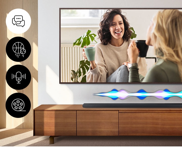 เทคโนโลยี Q-Symphony ช่วยให้ทั้งลำโพงของ TV กับซาวด์บาร์ทำงานร่วมกันได้เพื่อที่สุดแห่งการประสานพลังเสียง ที่จะให้เสียงอันลงตัวด้วย AI ไหลผ่านในทุกช่องทาง