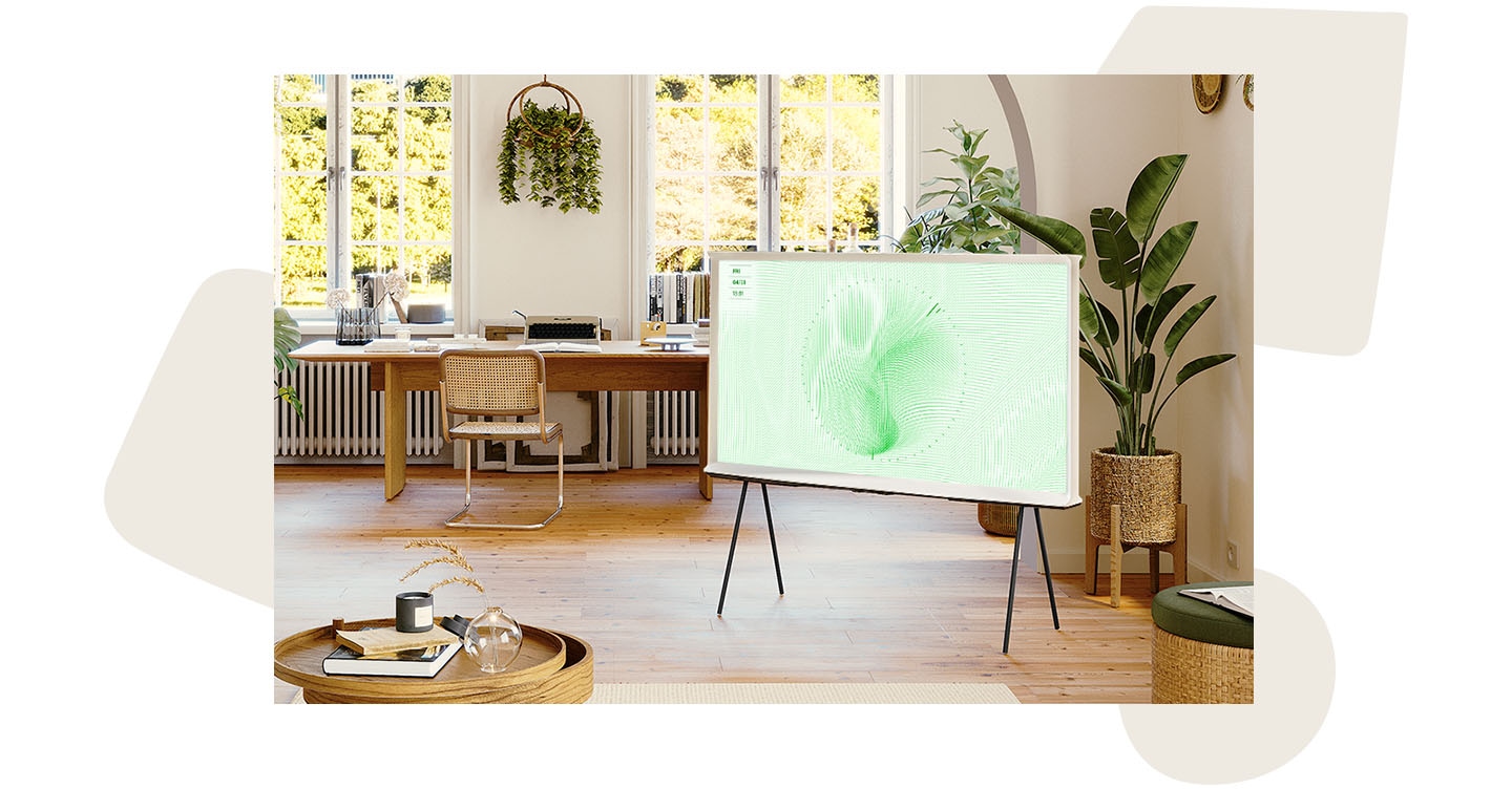 ในพื้นที่อยู่อาศัยร่วมสมัย ทีวี The Serif หมุนเวียนไปตามรูปแบบต่างๆ บนหน้าจอในโหมด Ambient